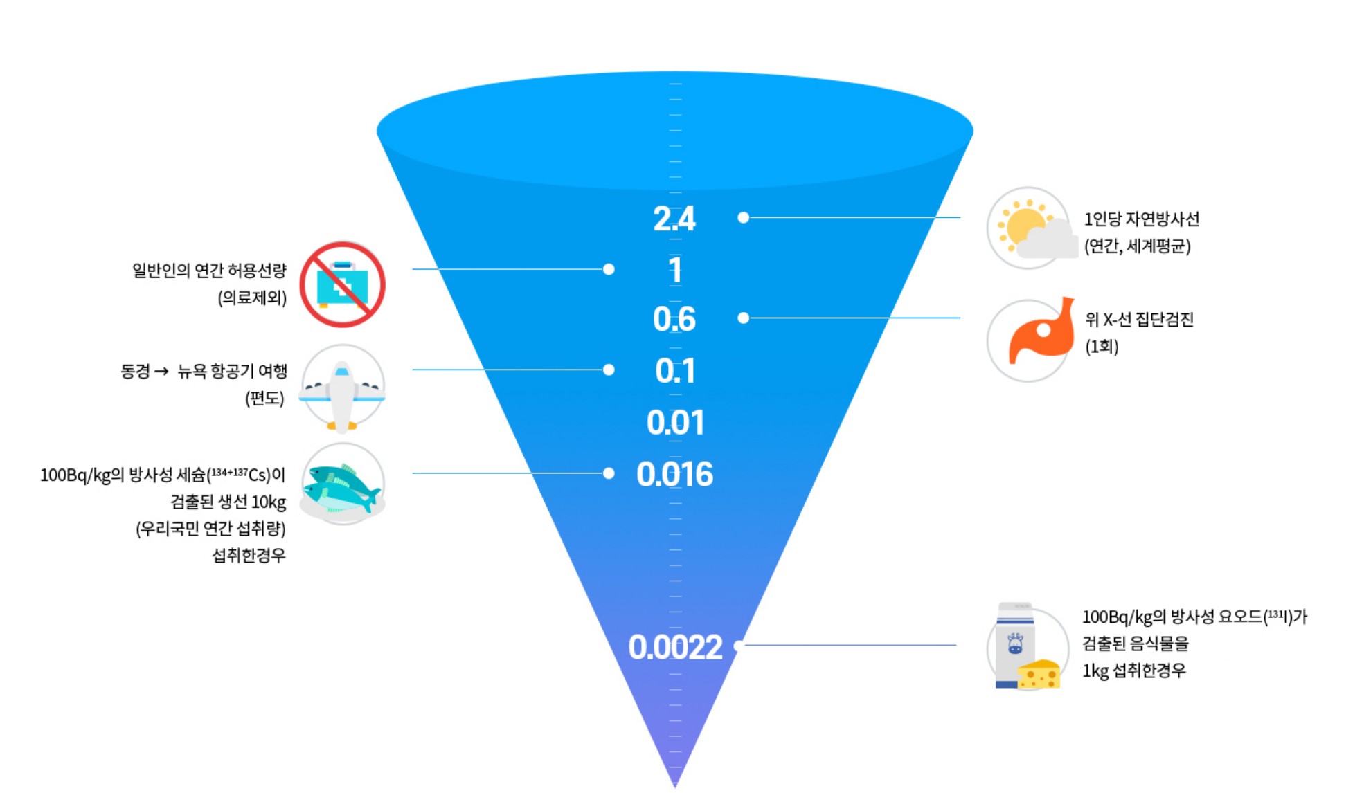 ▶100Bq/kg 방사성 세슘에 오염된 생선 10kg 섭취한 경우 (우리 국민 연간 섭취량) 0.016 mSv 노출