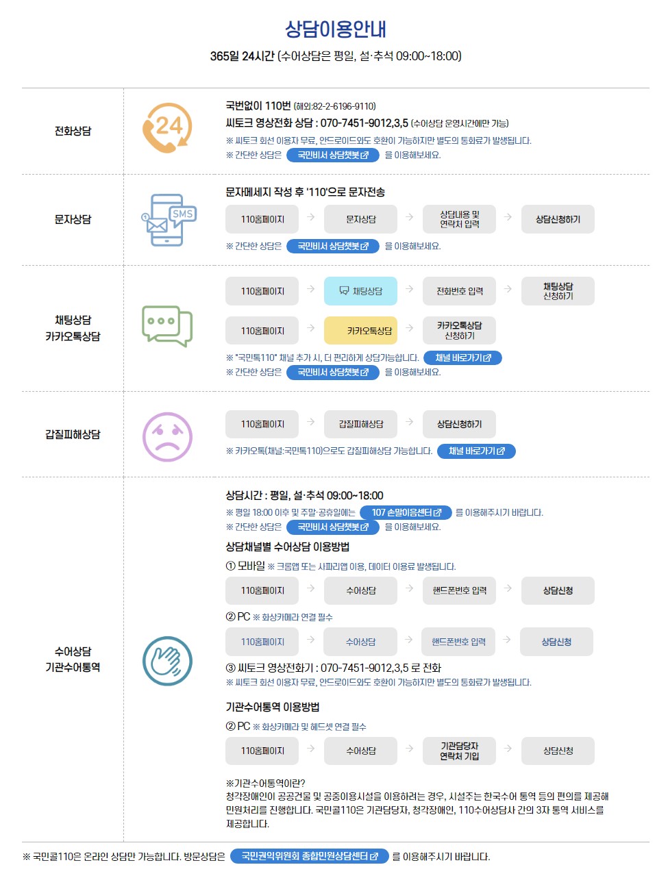 상담 방법은 국번 없이 110으로 전화를 걸면 되며 해외에서도 82-2-6196-9110으로 전화하면 된다. 문자 서비스는 메시지 작성 후 110번으로 전송하면 답변을 받는다.